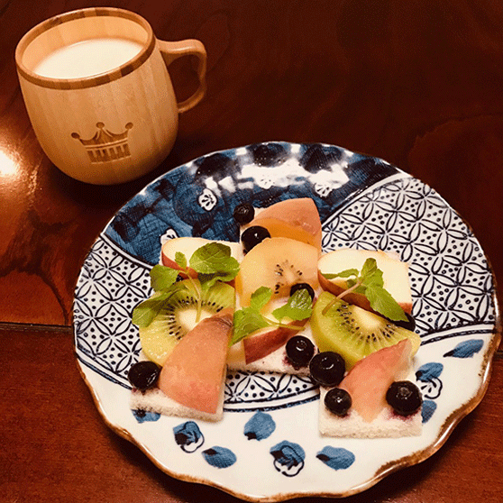 フルーツオープンサンドをつくって、カフェオレマグでカフェオレをのみながら、